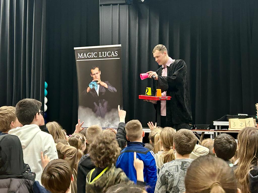 W ramach karnawałowych atrakcji, 24 lutego w naszej szkole gościł iluzjonista Magic Lucas . W swoim programie mistrz iluzji zaprezentował sztuczki karciane, z piłeczkami, z kolorowymi chusteczkami, magicznymi książkami, metalowymi kółkami i balonami, czy skrzynką z ostrzami. Do swoich występów zapraszał uczniów, aby mu asystowali – dzięki czemu mogli podejść bliżej, sprawdzać rekwizyty jak również próbować swoich sił w magii. Nie zabrakło śmiechu, zdziwienia, zachwytu i wielkiego zaskoczenia. Magik wprowadził wszystkich w wspaniały humor na resztę dnia.