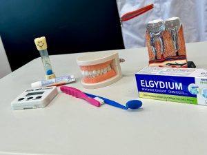 Pani stomatolog tłumaczyła najmłodszym uczniom jak należy dbać o higienę jamy ustnej, w jaki sposób i ile czasu należy czyścić zęby. Dzięki filmowi, pogadance oraz zabawie dzieci dowiedziały się czym jest próchnica, co ją powoduje i jak jej zapobiec, czego potrzebujemy do umycia zębów, jak często powinno się myć zęby by były czyste i zdrowe.